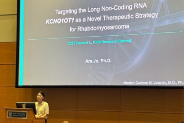 - Dr. Ara Jo, a postdoctoral fellow in Dr. Corinne Linardic’s lab, for her work on a novel long non-coding RNA therapeutic for Rhabdomyosarcoma.